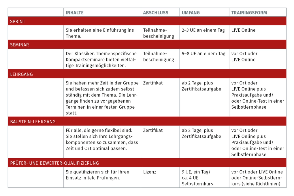 Wir stellen Ihnen die unterschiedlichen Trainingsformate vor: Inhalte, Abschlüsse, Umfang und die entsprechende Trainingsform.